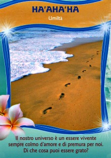 Ha’Aha’ha – Umiltà Il nostro Universo è un essere vivente sempre colmo di Amore e di premura per noi. Di che cosa puoi essere grato? Prendi coscienza della totalità. Sei una parte del grande intero e appartieni a esso, proprio come ogni altro è una parte del tutto e appartiene alla totalità. Tutto ha lo stesso valore ed è al tempo stesso unico. Tu non sei né più degno né meno degno di un altro essere, perché siamo tutti fatti della stessa materia. Non è necessario competere con gli altri, vantarsi in loro presenza o dar prova di te in qualsiasi modo. L’Universo è Abbondanza, Amore e Gioia traboccante. C’è più del necessario per tutti: se con umiltà prenderai coscienza dell’infinito spazio spirituale , abbandonerai la tua ossessione per la mancanza. In questo modo permetterai alla tua guida superiore di farti percorrere nuove vie dell’Amore e di stringere nuove ed inaspettate relazioni.