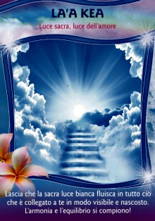 La’A Kea – Luce Sacra, Luce dell’Amore Lascia che la sacra Luce Bianca fluisca in tutto ciò che è collegato a te in modo visibile e nascosto. L’armonia e l’equilibrio si compiono. La’A Kea significa “Luce Sacra” o “Luce dell’Amore” e si riferisce alle cose buone e luminose come la luce del Sole, la Felicità, la Gioia, l’Amore o la Musica. E’ una luce pura e radiosa, bianca e cristallina e serve a dare forza, guarigione e armonia. Può assumere qualunque colore desideri, o sfavillare in più colori contemporaneamente. Comincia a sprigionarsi e a splendere nella nostra aura e può essere trasferita su altre persone o altri luoghi; rinforza i sogni e le illuminazioni, armonizza noi e il nostro ambiente e può essere emanata in qualunque direzione si desideri.